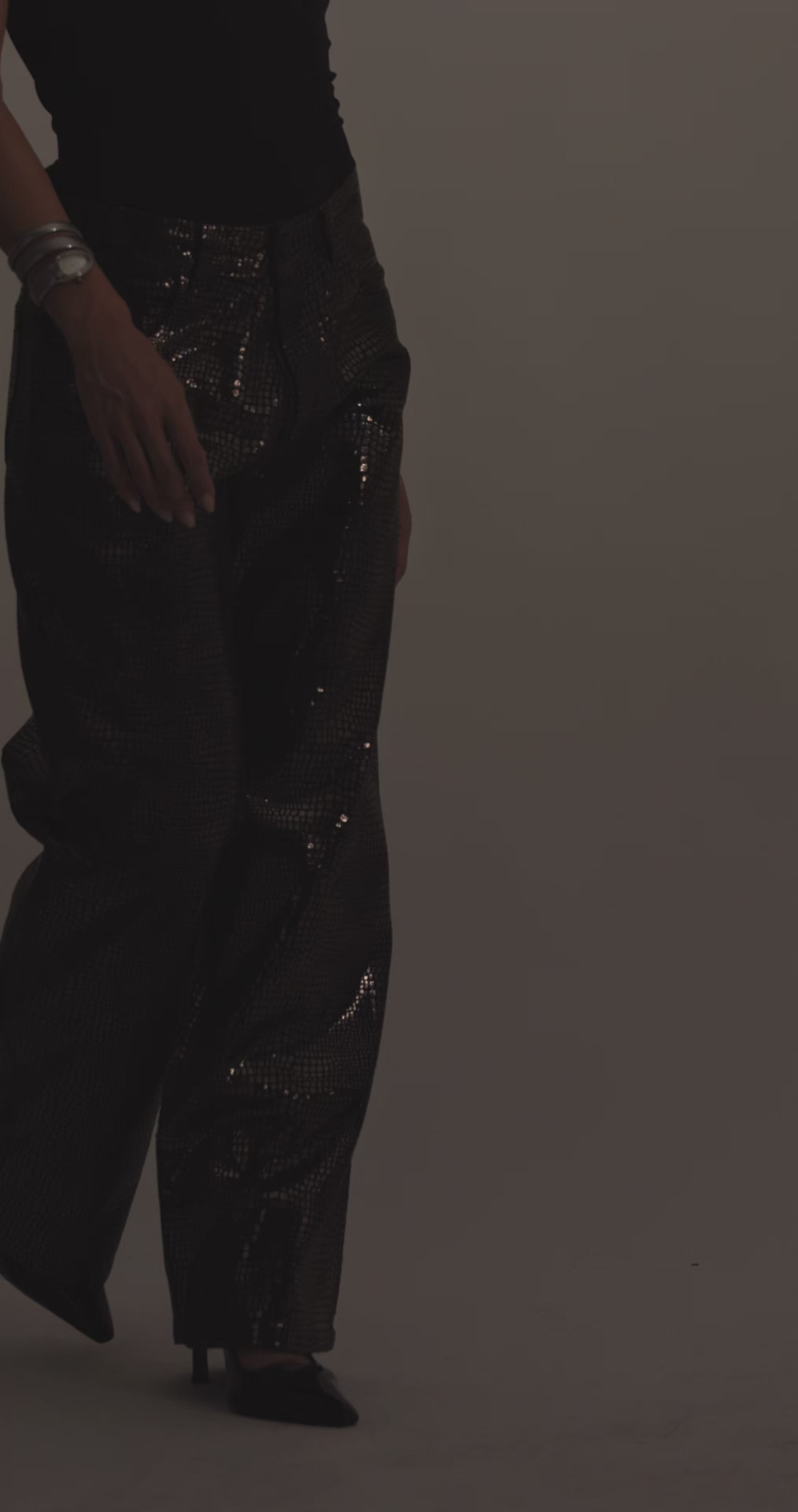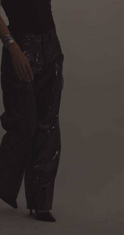 Calça jeans com cintura baixa e aplicação manual de textura croco em foil marrom: um trabalho artesanal que transforma o jeans em uma verdadeira obra de arte.