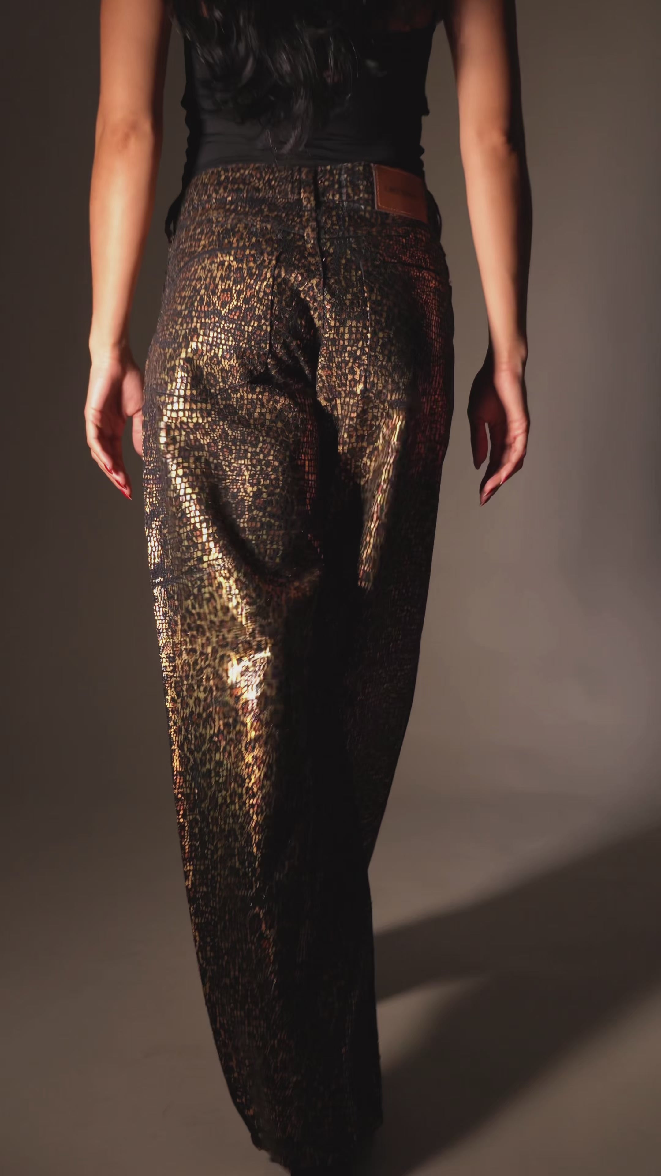 Calça jeans com cintura baixa e aplicação em foil com textura craquelada e estampa de onça em tom mais quente — uma verdadeira obra de arte em forma de jeans. A textura é o grande destaque: ousada, marcante e absolutamente única.