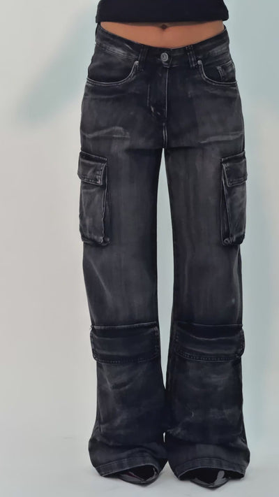 CALÇA JEANS POCKET BLACK SMOKE possui cós médio e modelagem reta, com 4 bolsos cargo, sendo dois nas laterais e dois bolsos frontais.