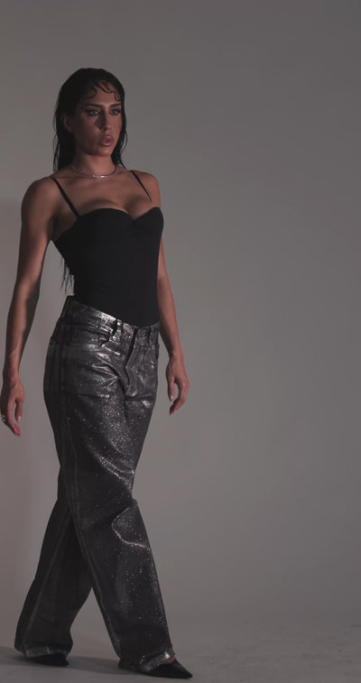 Calça jeans com cintura baixa e textura exclusiva em foil prateado com glitter, efeito metálico prata: um brilho que reflete atitude e transforma o jeans em obra de arte. A aplicação é feita à mão, revelando nuances únicas e cheia de personalidade.